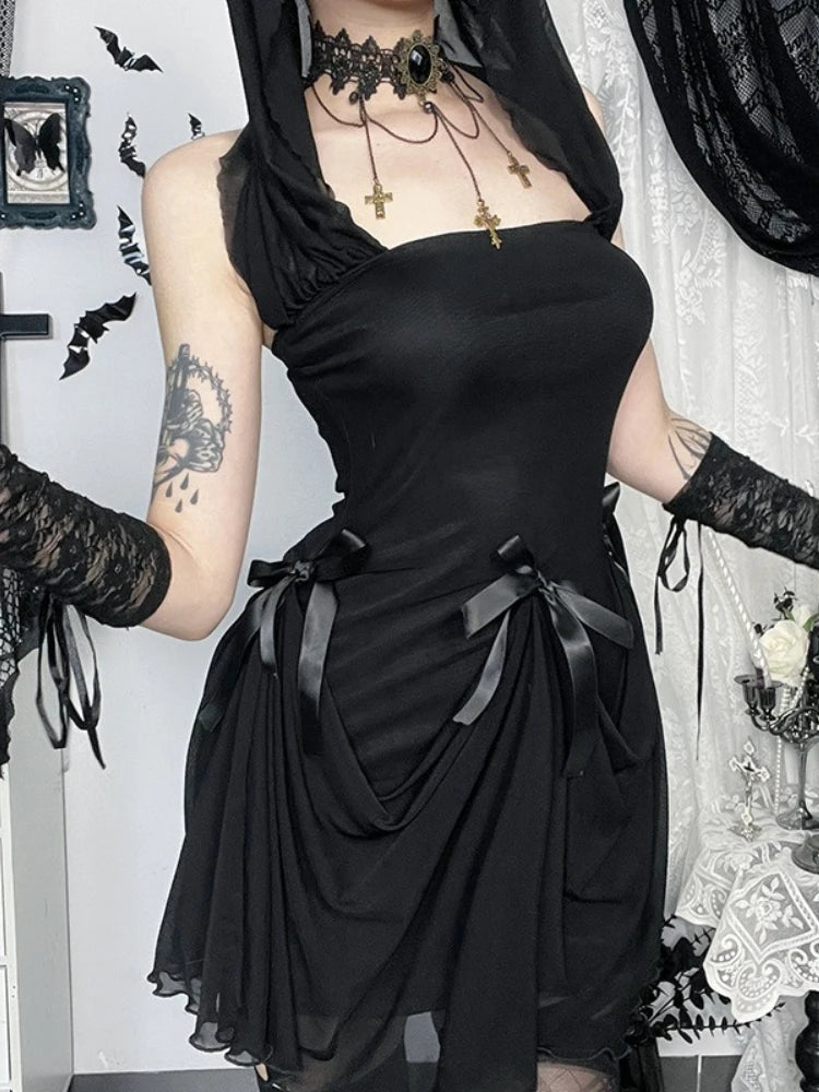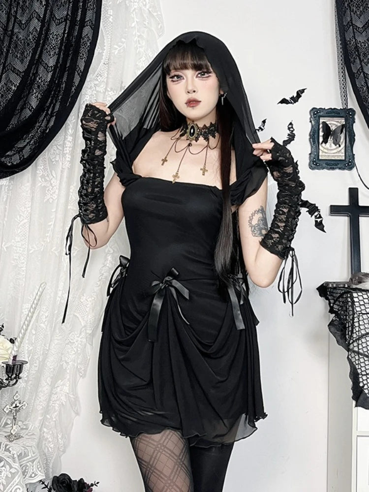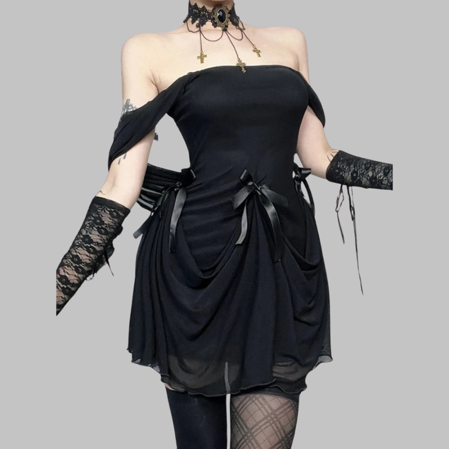 Musta grunge-mekko, jossa pitkät hihat ja drapeerattu hame