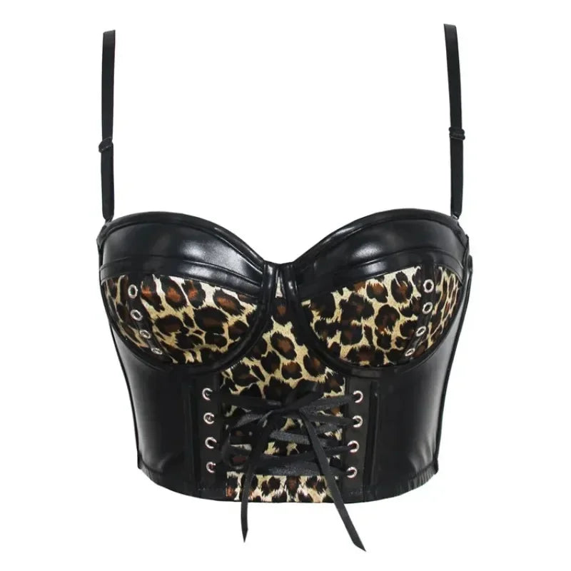 Musta leopardikuvioinen ja keinonahkainen nauhakorsetti – villi punk-tyyli Katso vaihtoehdot