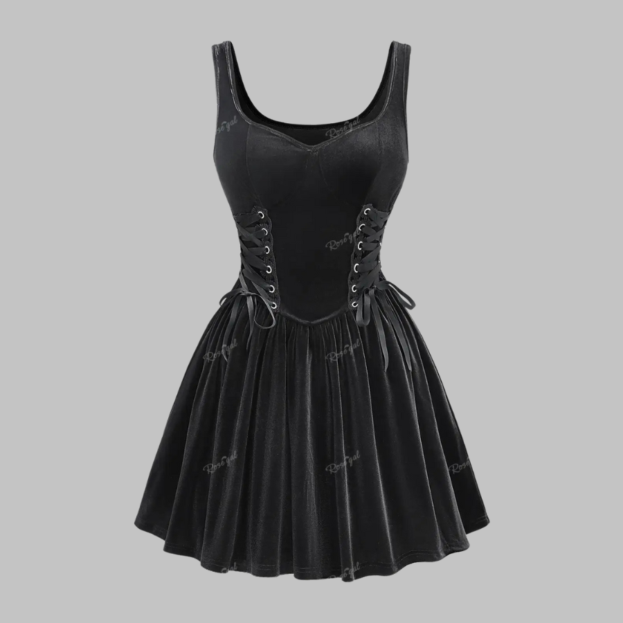 Plus-kokoinen musta goottilainen mekko korsetilla ja levenevällä hameella