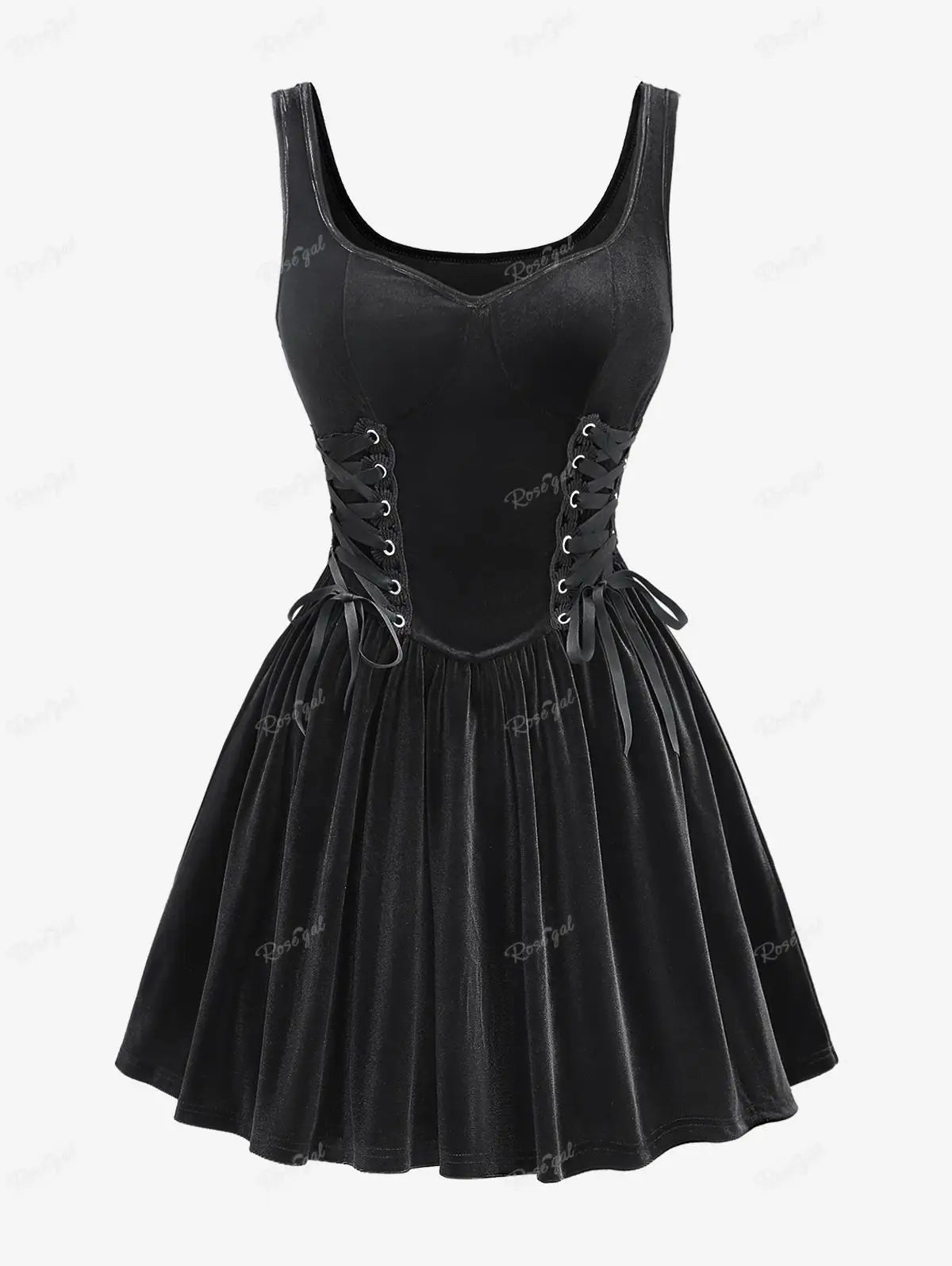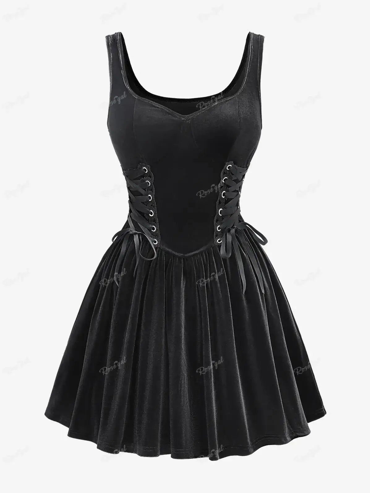 Plus-kokoinen musta goottilainen mekko korsetilla ja levenevällä hameella Katso vaihtoehdot