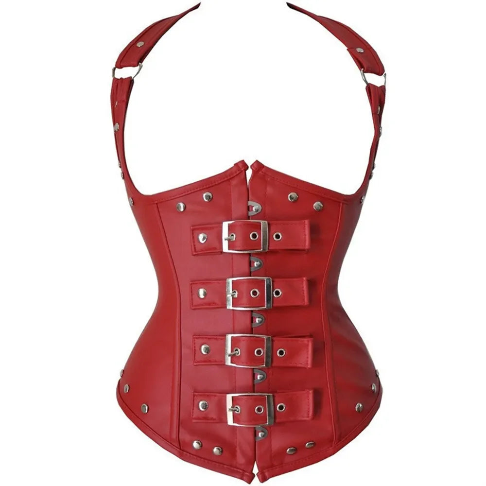 Punainen keinonahkainen korsetti soljilla – punk rock -tyyliä naisille